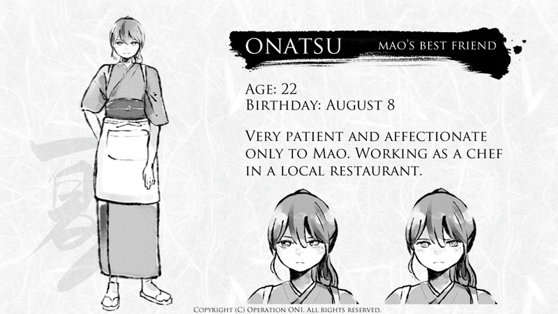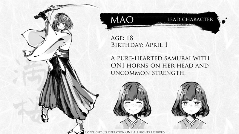 | Set in samurai-era Japan, tensions rise between humans and the powerful Empire of Spirits. Mao, a formidable samurai marked by mysterious ONI (demon) horns on her head, has known only loneliness after losing her parents and enduring a harsh upbringing by a tyrant. Her closest bond is with her best friend, Onatsu, whose love has been Mao's sole solace. As war erupts, Mao vows to protect both her homeland and Onatsu, but Onatsu declares, "This is the end of our friendship," leaving Mao heartbroken. The true meaning of Onatsu's words and the fate of their friendship lie in the mystery of Mao's horns. |